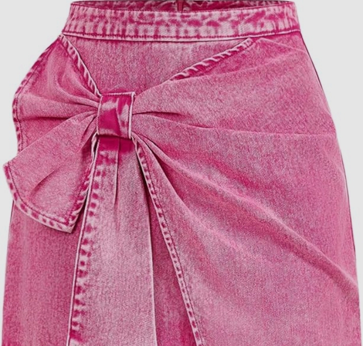 This product is a pink denim mini skirt from SB LUX featuring large bow details on both sides.